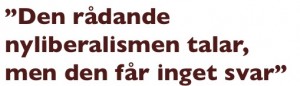 – Vi lever i kvartalskapitalismens land… Med en samling anonyma människor som får sätta agendan. Vi får höra att marknaden kräver. Men ingen talar om vem marknaden är. Den rådande nyliberalismen talar, men den får inget svar. Det är rovdjurskapitalism.