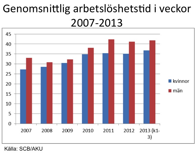 Den genomsnittliga arbetslöshetstiden för kvinnor har ökat från 27 veckor 2007 till 37 veckor under de första tre kvartalen 2013. För män är motsvarande siffror 33 veckor 2007 till ungefär 42 veckor 2013. Ökningen i genomsnittlig arbetslöshetstid är alltså 35 procent för kvinnor och 26 procent för män.