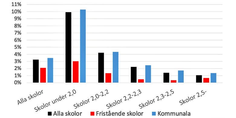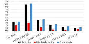 I nuläget kan inte friskolor med kö ta emot nyanlända. 80 procent av de kommunala skolorna har i dag tagit emot nyanlända. 63 procent av friskolorna har gjort detsamma. Och skolorna med bäst förutsättningar tar bara in ett fåtal nyanlända elever.