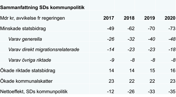 Samtidigt finns satsningar i SD:s budget som riktar sig till kommunerna, bland annat inom vården. Dessa kommer totalt upp i 16 miljarder 2020. För att täcka underskottet är SD:s lösning att kommunerna höjer kommunalskatten, men inte heller då kommer kommunernas underskott att kunna täckas. Enligt LO kommer effekten av SD:s kommunpolitik generera ett underskott 35 miljarder.