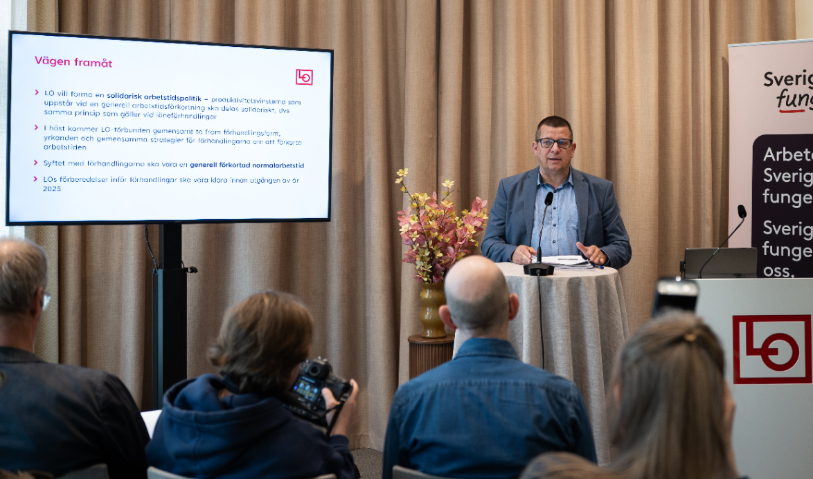 – I Sverige arbetar vi väldigt mycket. Vi har högst arbetstid jämfört med våra grannländer. Medan arbetstiden minskar i jämförbara länder har den stått still i Sverige. Den har till och med ökat sedan 80-talet. Det är inte hållbart i längden. Det är dags att sänka arbetstiden för alla som arbetar i Sverige, det har vi helt enkelt råd med, sa Johan Lindholm, LO:s ordförande, på pressträffen.