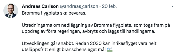 Även Kristoffer Tamsons (M), oppositionsregionråd i Region Stockholm kommenterade Bromma-beskedet: ”Istället för att avveckla flyget ska vi samla oss och göra Stockholm till elflygets huvudstad.”