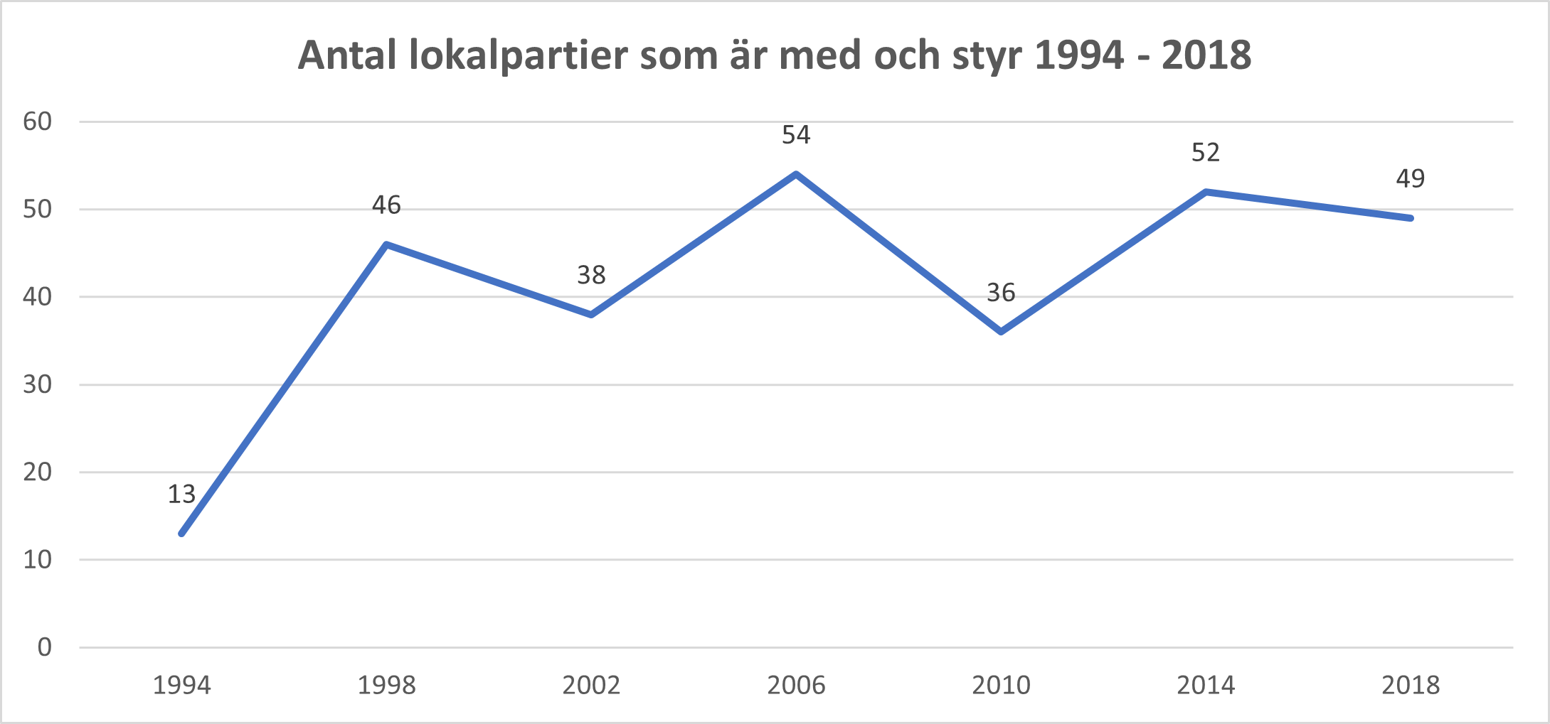 De senaste två valen har lokalpartierna tagit allt fler av de svenska kommunfullmäktigemandaten. De har gått från 514 platser 2010 till 575 mandat i det senaste valet. I 49 svenska kommuner är ett lokalt parti med och styr i dag.