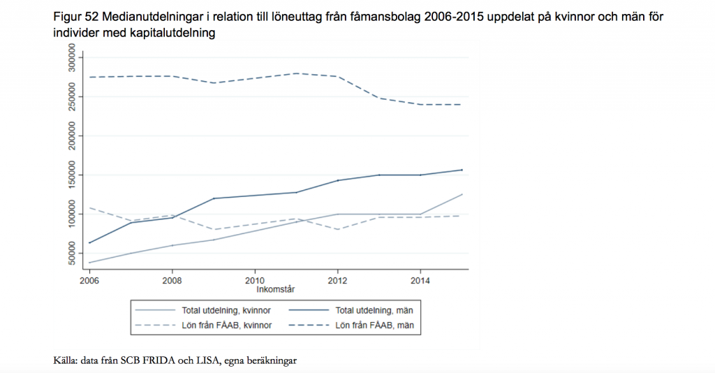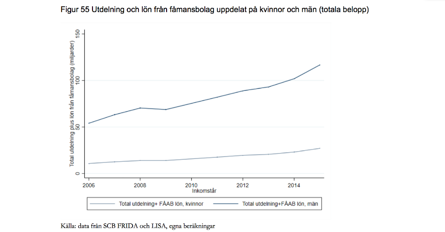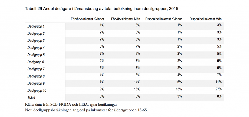 I den övre inkomstdecilgruppen (de rikaste 10 procenten) sett till total disponibel inkomst var 27 procent av männen och 15 procent av kvinnorna delägare i ett fåmansbolag. Det kan jämföras med att 8 respektive 3 procent av kvinnor och män i befolkningen i stort är delägare i ett fåmansbolag.