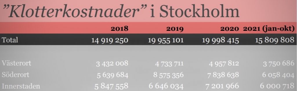 Och kostar gör det. I Stockholm lade man nästan 20 miljoner både år 2019 och 2020 på klottersanering. Från årsskiftet i år har det kostat runt 16 miljoner.
