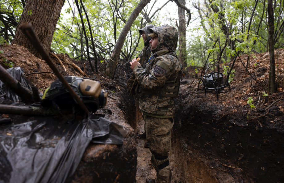 I skyttegraven håller Alexey upp några roterblad från en drönare i regnet. Två av dem har skotthål i sig från moteld. Liksom sin kamrat är Alexey Grygorenko lugn och har lätt till ett leende. Men inom honom bubblar det av känslor mot ryssarna.