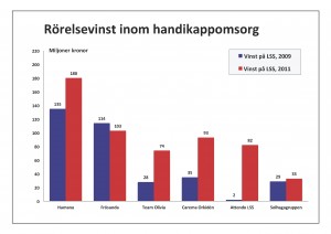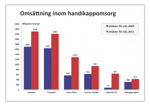 De sex största koncernerna i branschen – alla ägda av riskkapitalbolag – omsätter miljardbelopp. På bara två år har deras omsättning på handikappomsorg vuxit med 60 procent och vinsterna med 65 procent. 2011 landade omsättningen på nära 8 miljarder kronor, och den sammanlagda rörelsevinsten på 565 miljoner kronor. Vinstmarginalen var i snitt 7 procent. Det visar en kartläggning som publiceras i tidningen Intra och i Dagens Arena.