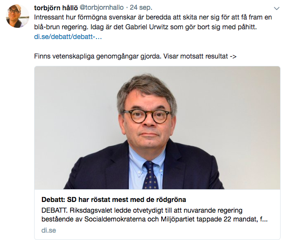 En som reagerade var LO-ekonomen Torbjörn Hållö. På Twitter skrev han »Intressant hur förmögna svenskar är beredda att skita ner sig för att få fram en blå-brun regering. Idag är det Gabriel Urwitz som gör bort sig med påhitt«.