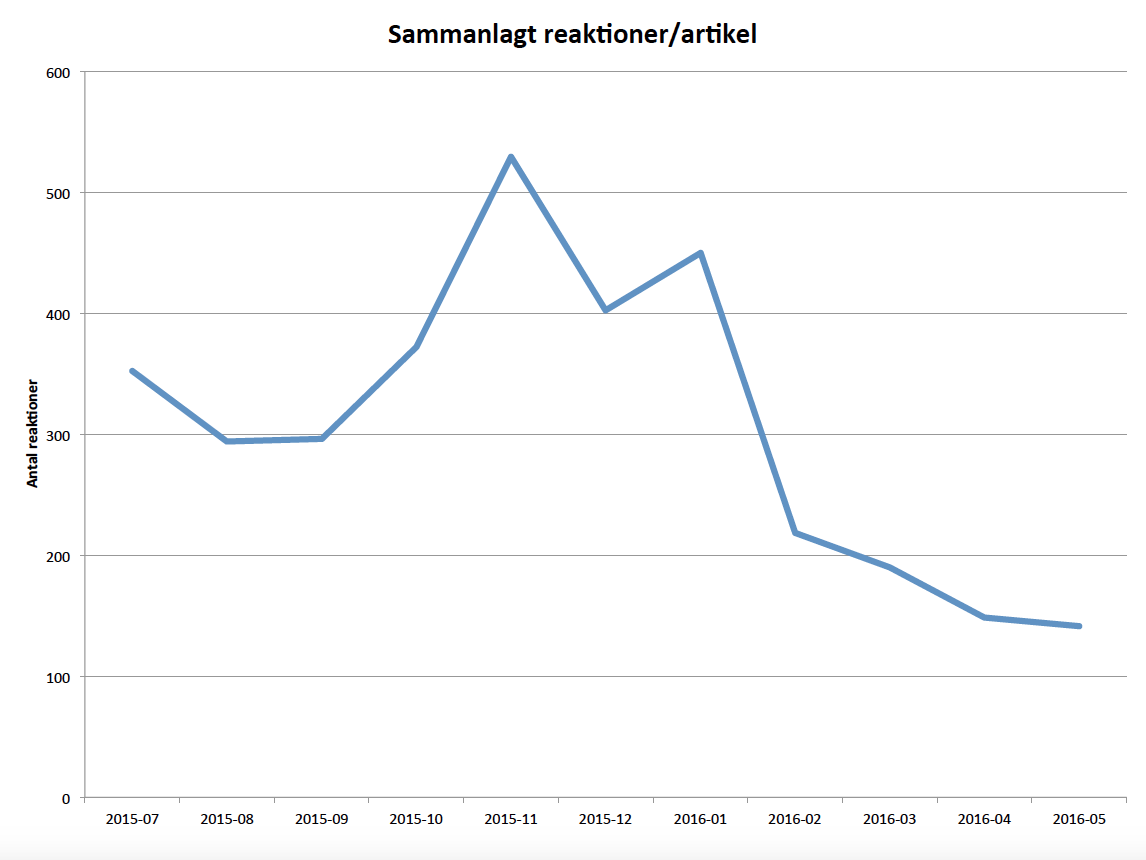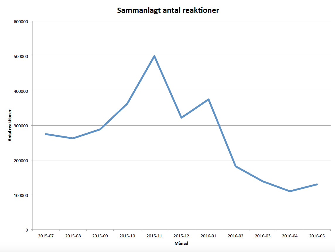 Sex månader senare har svenskarnas intresse för att sprida, kommentera och gilla material från hatsajter minskat dramatiskt. I maj fick sajterna enbart ihop till 130 000 reaktioner – trots att i princip lika många artiklar producerades. Det konstaterar LO i en ny granskning där de mätt reaktioner på Facebook, Twitter och Linkedin.