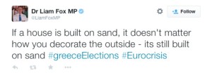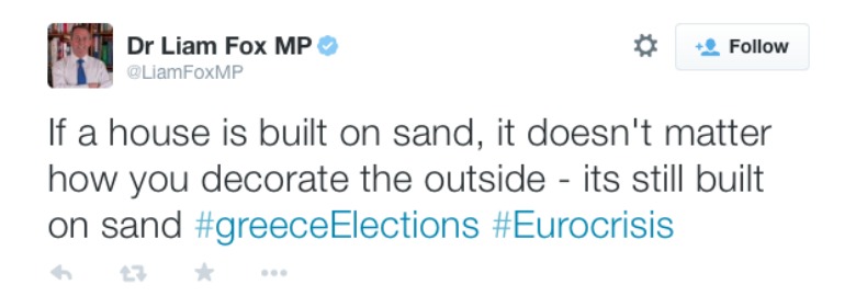 ”Det grekiska valet kommer att öka den ekonomiska osäkerheten i Europa. Därför måste Storbritannien hålla sig till sin plan för att leverera trygghet på hemmaplan”, skriver han.