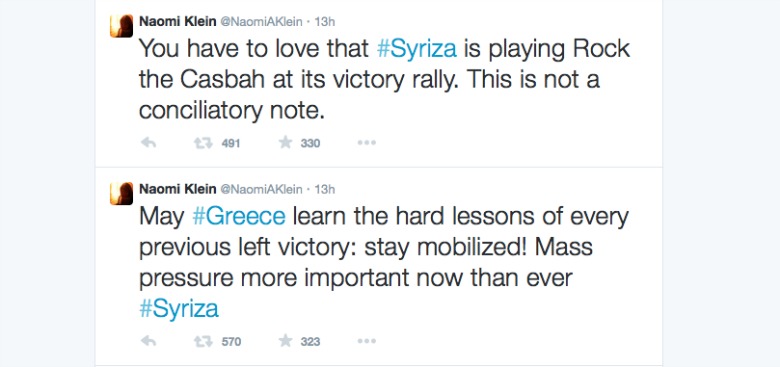 ”Hoppet kommer, rädslan rymmer. Syriza, Podemos, vi kommer att vinna”, sade han strax innan vallokalsundersökningens siffror visades.