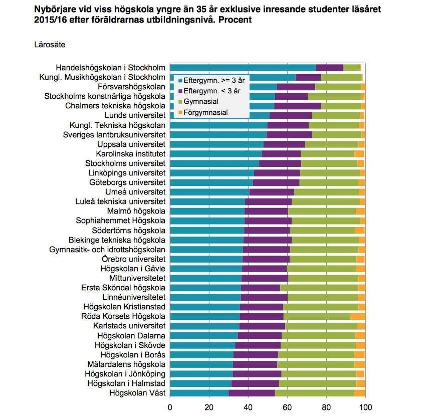 Bland de under 35 år som började högskolan läsåret 2015/2016 hade 38 procent högutbildade föräldrar, vilket innebär minst 3 års högskolestudier, vilket kan jämföras med att runt var fjärde person i samma ålder i befolkningen har högutbildade föräldrar.