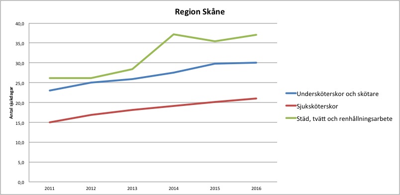 Förra året var undersköterskor och skötare som arbetar inom vården i Region Skåne i snitt sjukskrivna 30 dagar. Det kan jämföras med 2011 då snittet låg på 23 dagar.