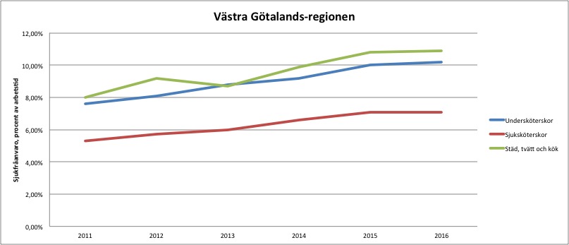 Även i Västra Götaland, som redovisar sjukfrånvaron i procent, ökar sjuktalen. Förra året var undersköterskor sjukskrivna 10,2 procent av arbetstiden, 2011 låg siffran på 7,6 procent.