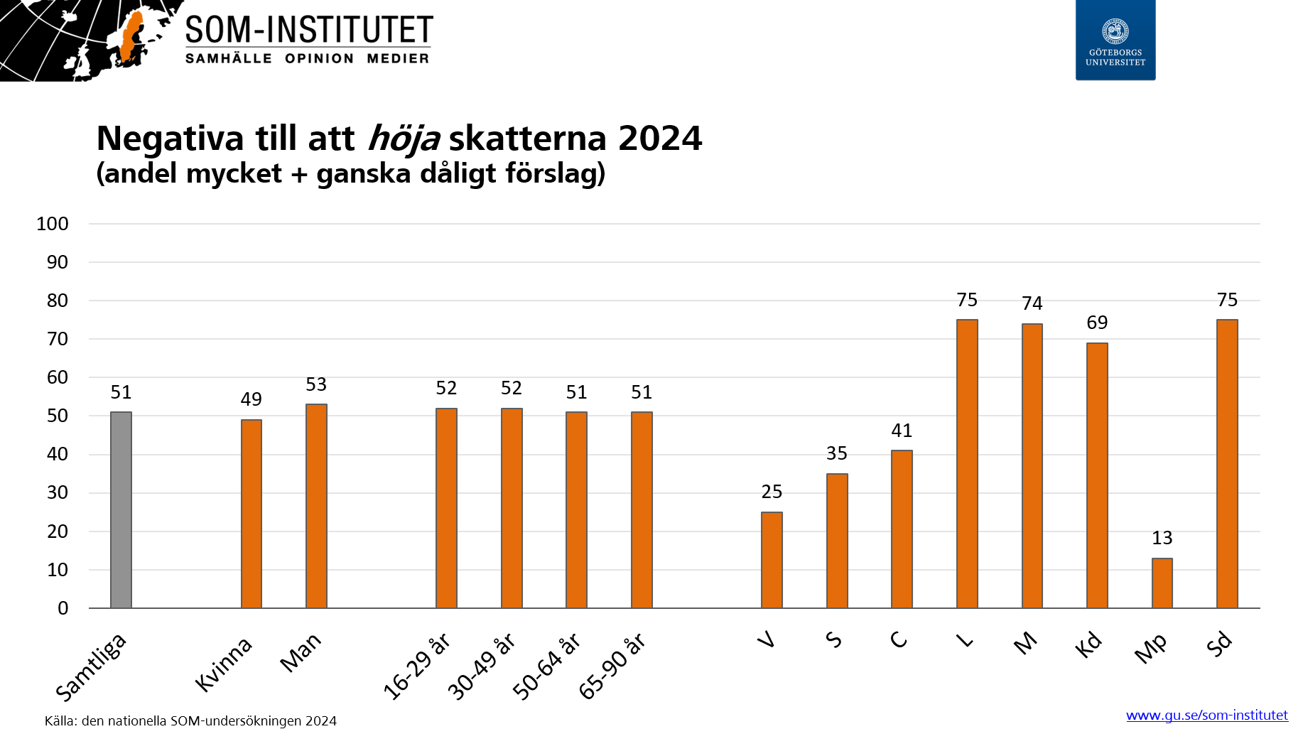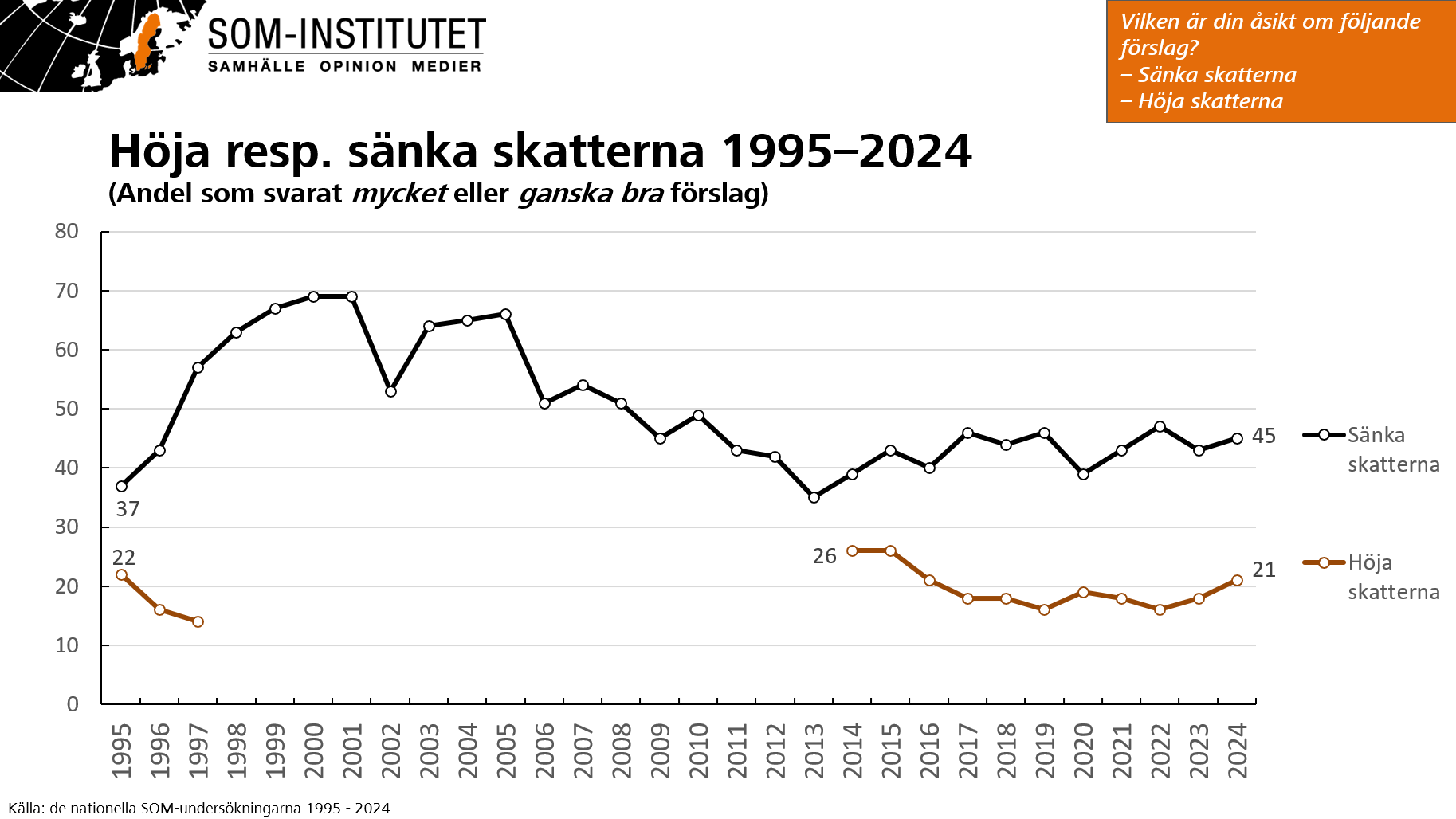 Att föreslå höjda skatter är lite av ett tabu som politiker i Sverige i dag. Mätningar sedan 1995 från SOM-institutet visar att de flesta svenskar tycker att det är ett dåligt förslag att höja skatten. Det har fluktuerat och mellan åren 2000 och 2001 var det nästan 70 procent som svarade att det är ett bra förslag att sänka skatterna. I senaste mätningen från 2024 var andelen 51 procent som tyckte det var ett dåligt förslag att höja skatterna. Medan 21 procent ansåg att det är ett dåligt förslag att sänka skatterna.