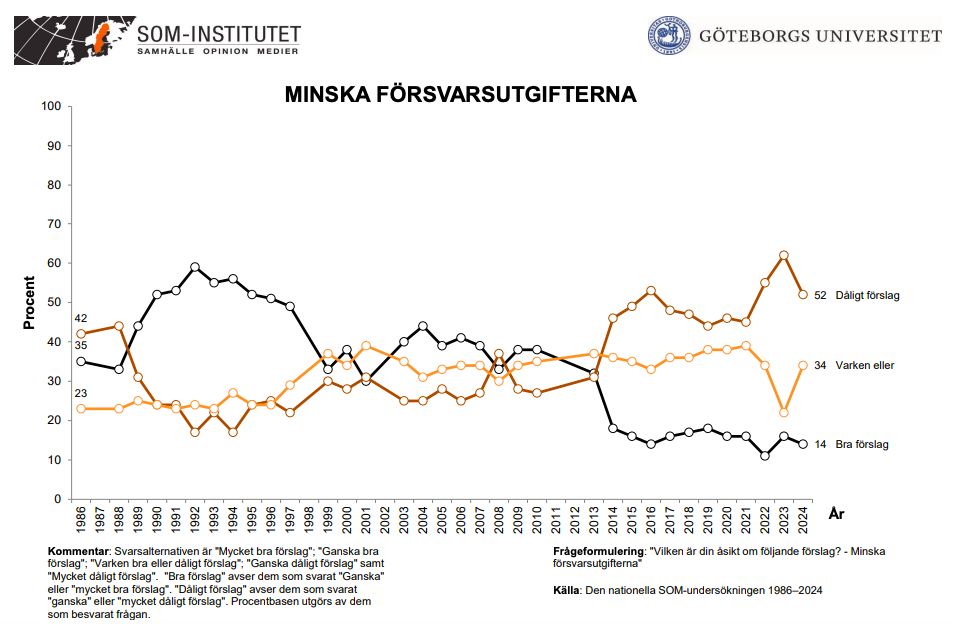 SOM-institutet har gjort mätningar om svenskarnas inställning till minskade utgifter till försvaret sedan 1986. I den frågan har opinionen skiftat från att vara positivt inställd till minskade utgifter, till negativt inställd. Många är också oroliga för militära konflikter (44 procent) och situationen i Ryssland (60 procent). 35 procent är oroliga för ett nytt världskrig.