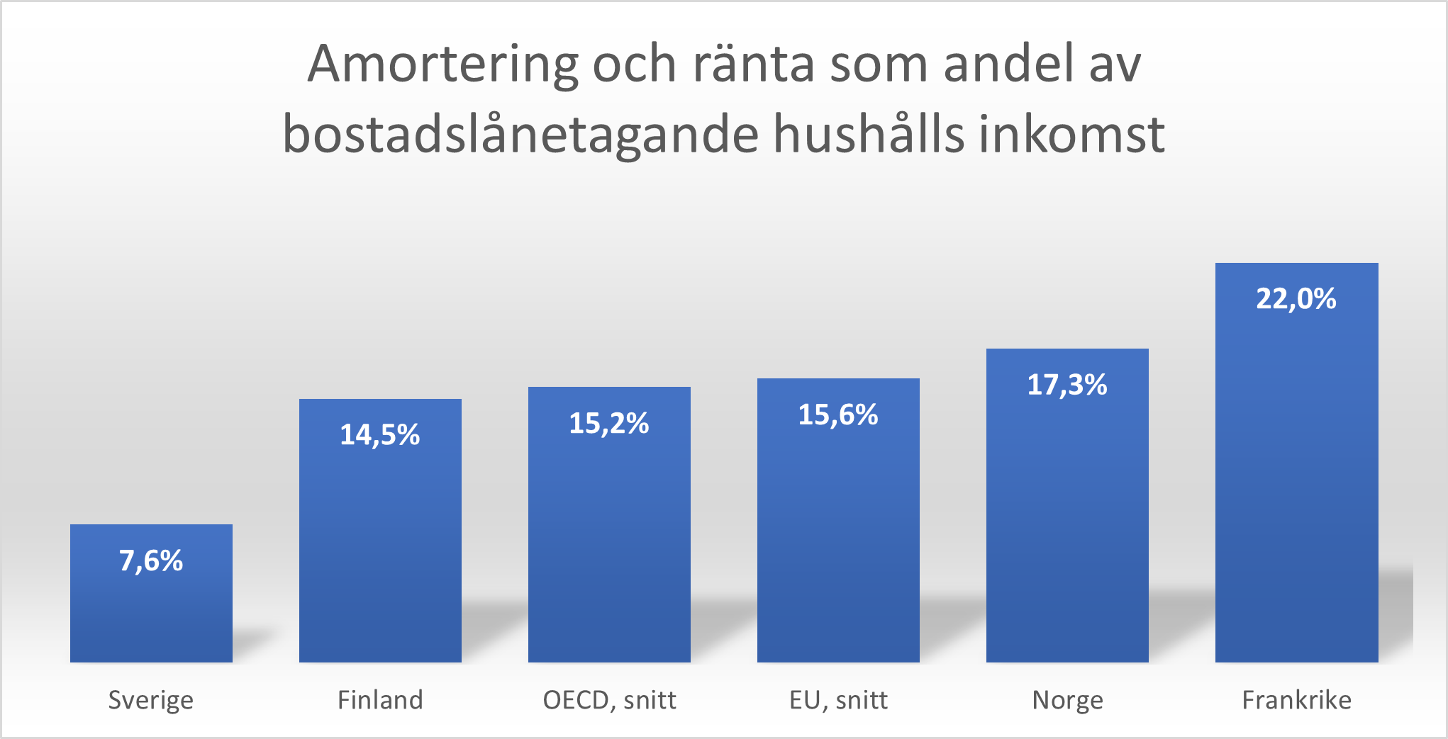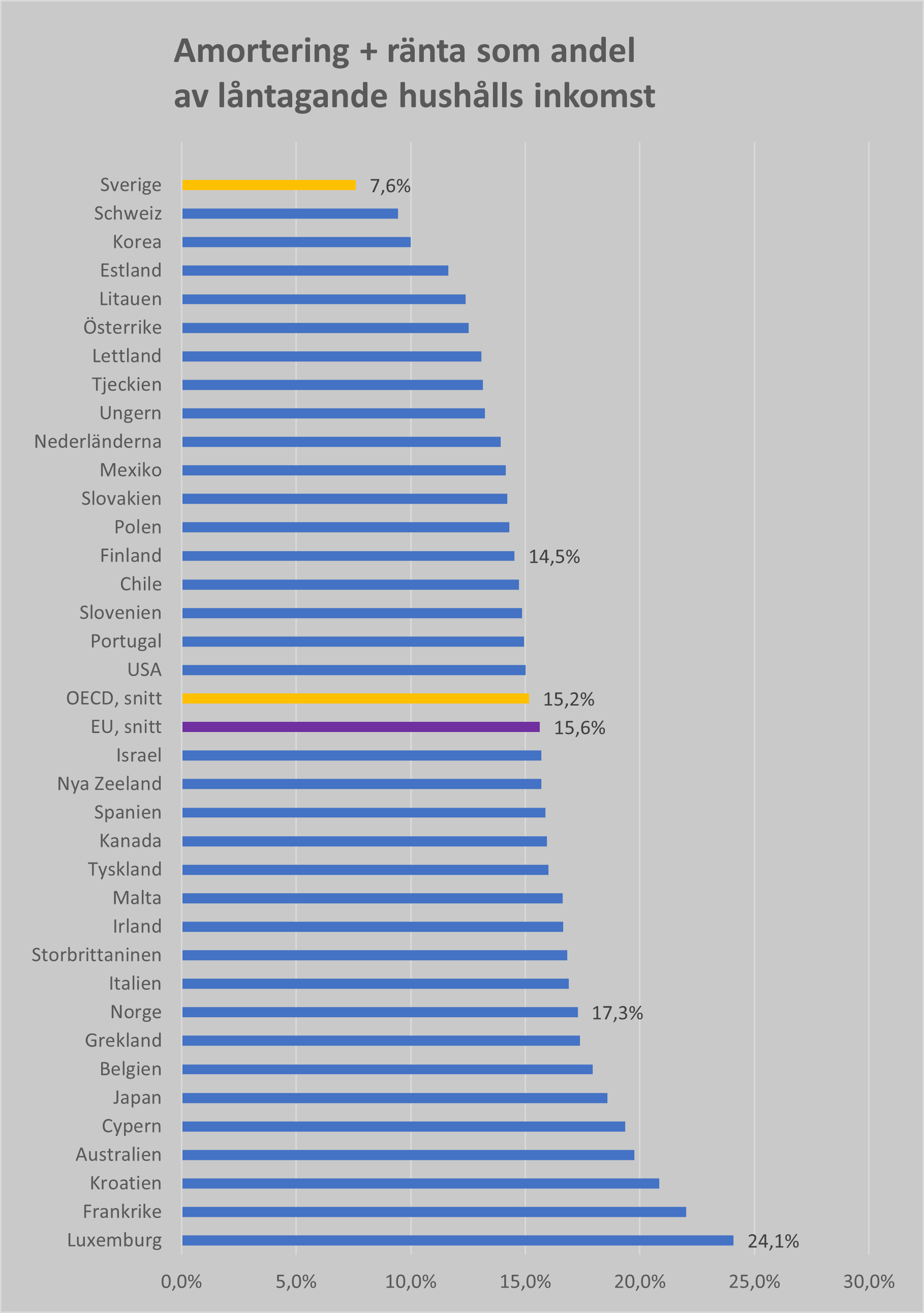 Siffrorna visar att de svenska bolånetagarna betalar minst av alla länders låntagare i amorteringar och ränta. Enligt OECD:s sammanställning betalar de svenska bolånetagarna i genomsnitt 7,6 procent av sin disponibla inkomst i amortering och ränta. Detta är ungefär hälften av snittet inom både OECD och EU.