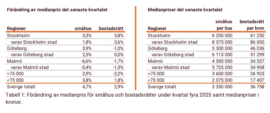 Medianpriserna för småhus ökade med 4,7 procent och för bostadsrätter med 2,9 procent under fjärde kvartalet. Bolåneräntorna fortsatte att sjunka från 2,90 procent till 2,77 procent, enligt rapporten.