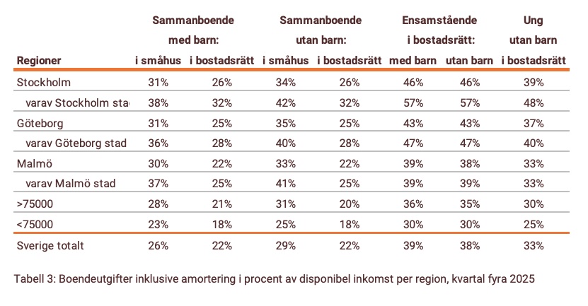 Möjligheterna att köpa bostad skiljer sig dock väldigt mycket beroende på om du är sambo och var i landet du bor. En ensamstående med barn som bor i bostadsrätt i Stockholms stad får lägga 57 procent av sin disponibla inkomst på boendet. I Göteborgs stad får en ensamstående lägga 47 procent av inkomsten för en bostadsrätt.