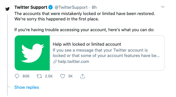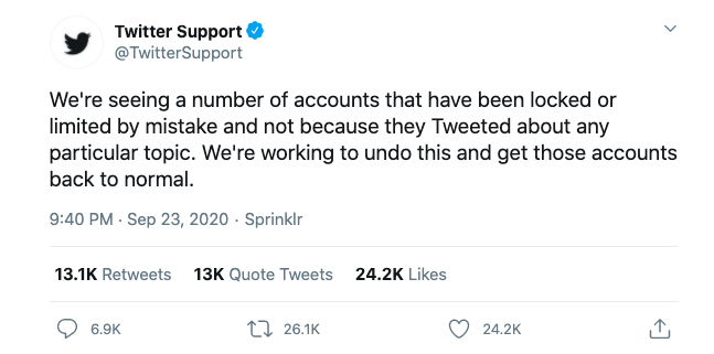 Under onsdagen uppmärksammade även Twitter att konton blockats över hela världen. De dementerar ryktena om att det skulle bero på något specifikt ämne som twittrarna valt att skriva om.