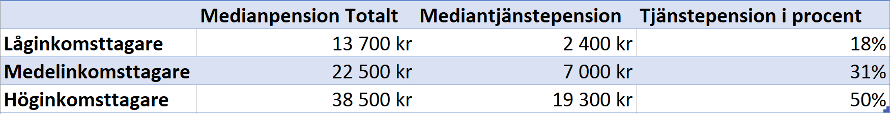 En genomsnittlig pensionär som arbetat sedan unga år fick 15 232 kronor utbetalt i allmän pension och cirka 7 000 kronor i tjänstepension, före skatt. Nästan var tredje krona på medelpensionärens konto kom alltså inte från staten, utan från tjänstepensionen.