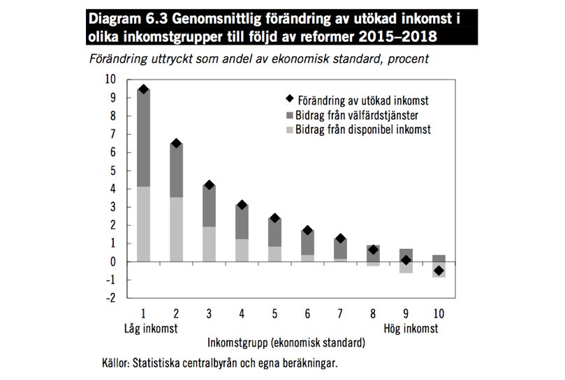 Fördelningsprofilen på den här budgeten skiljer sig från S-MP-regeringens tidigare budgetar, som gynnade låginkomsttagare mer i förhållande till höginkomsttagare. Så visar det här diagrammet över tre år under förra mandatperioden: