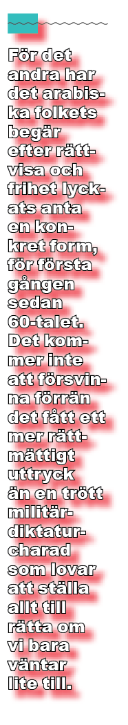 För det andra har det arabiska folkets begär efter rättvisa och frihet lyckats anta en konkret form, för första gången sedan 60-talet. Det kommer inte att försvinna förrän det fått ett mer rättmättigt uttryck än en trött militärdiktatur-charad som lovar att ställa allt till rätta om vi bara väntar lite till.