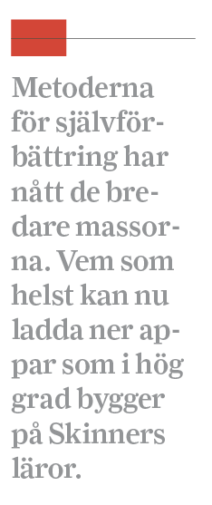 Metoderna för självförbättring har nått de bredare massorna. Vem som helst kan nu ladda ner appar (vi kan kalla dem beteendemodifikationsappar) som i hög grad bygger på Skinners läror. Ett exempel är Lose It. Här börjar användaren med att ställa in sin idealvikt och ange en tidslinje. Sedan skickas feedback och grafer till användaren som därigenom kan modifiera sina beteendemönster. Uppmuntrande ord och poäng hjälper användaren på traven.