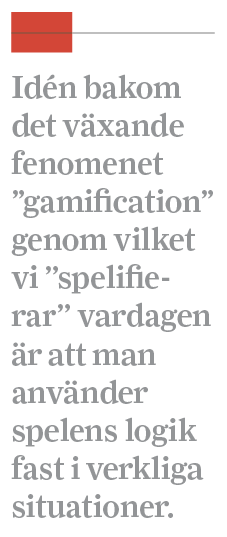Och så ser också idén ut bakom det växande fenomenet ”gamification” genom vilket vi ”spelifierar” vardagen. Man använder spelens logik fast i verkliga situationer. Göra tråkiga saker roliga.