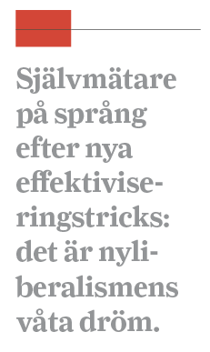 Självmätare på språng efter nya effektiviseringstricks: det är nyliberalismens våta dröm. De står inte passivt och väntar på att bli tillsagda. De har internaliserat nyliberalismens förväntningar: att inte bara utveckla sin egen produkt, utan också hitta nya sätt att sälja sig själva.