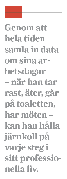 Precis så förklarar en entreprenör motivet bakom sitt självmätande. Det är som att ”driva en start-up”. Han beskriver för Financial Times hur han alltid i sitt professionella liv letat efter relevanta data för att kontrollera hur det går för företaget. På så sätt får man fram vad han kallar ”under-the-hood-information”. Sådant som andra inte kan se. Det han från början bara gjorde på företaget gör han numera på sig själv. Och det gör underverk.