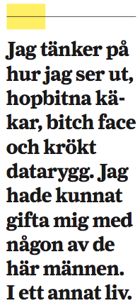 Vissa unga kvinnor, deras barn och män är här. De ser så saliga ut där de drar runt sina barnvagnar i leran och jag tänker på hur jag ser ut, hopbitna käkar, bitch face och krökt datarygg. Jag hade kunnat gifta mig med någon av de här männen. I ett annat liv.
