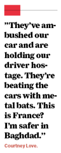 En redigt uppskrämd och förbannad Courtney Love Cobain sitter fast i en Uber-bil på väg till flygplatsen Paris – Charles de Gaulle.