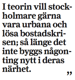 I teorin vill stockholmare gärna vara urbana, moderna och lösa bostadskrisen; så länge det inte byggs någonting nytt någonstans i deras absoluta närhet. Not in my backyard-fenomenet har spritt sig i ungefär samma utsträckning som andelen bostadsrätter. Kommunalpolitiskt har det alltså inte funnits några direkta incitament att lösa situationen. Chansen att det slår tillbaka är överhängande.