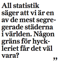 – Och fråga de med lägre inkomst om de tycker att deras liv är förstörda på grund av att de får bo i Farsta? All statistisk säger att vi är en av de mest segregerade städerna i världen. Någon gräns för hyckleriet får det väl vara? Ska man vara trovärdig ska man säga att var tionde lägenhet i innerstan ska ges åt flyktingar, och verkligen kvotera dem till grupper som inte finns där. Men det tror jag inte finns på den politiska dagordningen, så bort med alltihopa, säger han.
