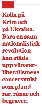 – Kolla på Krim och på Ukraina. Bara en sann nationalistisk revolution kan städa upp vänsterliberalismens cancersvulst som plundrar, rånar och begraver. Den ortodoxa revolutionen måste vara politisk, säger Tjernev.