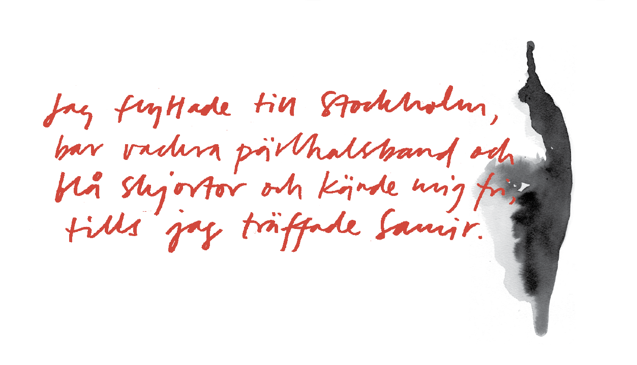 Jag träffade Samir i egenskap av doktorand vid Uppsala universitet och intervjuerna skulle också vara med i en bok om livet i förorten. Jag lämnade min förort några dagar efter att jag tagit studenten och lovade mig själv att starta om, att vägra vara platsbunden, fast i problemen, fast i andras blickar på en. Jag lovade mig själv att inte berätta för någon om var jag kom ifrån. Jag skulle bort, långt bort, och för att nå dit krävdes det av mig att jag lämnade det förflutna. Jag flyttade till Stockholm, bar vackra pärlhalsband och blå skjortor och kände mig fri, tills jag träffade Samir.