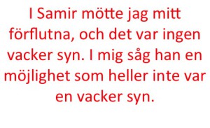 Ett minne: Samir sitter vid fönstret, med halva sin kropp utåt, han balanserar mellan att vara inne och ute. Jag säger åt honom att komma in, att han annars kan falla. Han svarar att det ändå inte spelar någon roll. Han säger att det inte spelar någon roll om han är levande eller död.