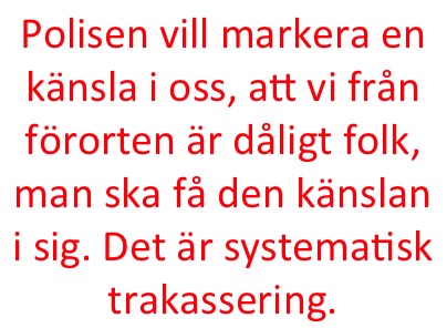 ”De vill markera en känsla i oss, att vi från förorten är dåligt folk, man ska få den känslan i sig. Det är en systematisk trakassering. Det är en systematisk trakassering för att ungdomarna i orten inte ska känna sig välkomna, inte känna sig fria, så att detta får en negativ effekt på dem i skolan, arbetslivet och det politiska systemet. För att vi inte ska utvecklas. Om folket i förorten hade utvecklats, då hade vi haft en annan politik i dag.”
