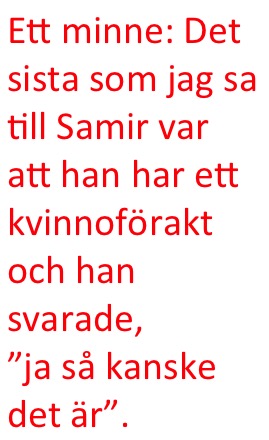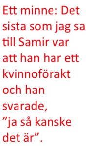 Ett minne: Det sista som jag sa till Samir var att han har ett kvinnoförakt och han svarade, ”ja så kanske det är”.
