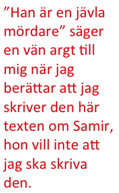 ”Han är en jävla mördare” säger en vän argt till mig när jag berättar att jag skriver den här texten om Samir, hon vill inte att jag ska skriva den.
