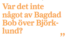 Även facit ligger i öppen dag. Det har inte gått så bra. Även den som intar en väldigt förstående och tålmodig inställning till Björklunds politik måste innerst inne tvivla. Kommer detta att någonsin fungera? Var det inte något av Bagdad Bob över Björklund? Vi såg svensk skola störta samman i bakgrunden, men vid mikrofonen denne ropande entusiast.