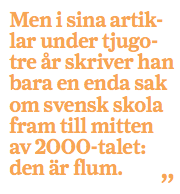 “Men så hände något avgörande. I 1969 års läroplan (Lgr 69), som togs fram av dåvarande utbildningsministern Palme, skiftades perspektivet. Tidigare hade kunskap setts som en förutsättning för jämlikhet. Nu kom jämlikhetsmålet att överordnas kunskapen. Det blev viktigare att alla barn läste samma stoff, i samma takt under lika lång tid än vad de faktiskt lärde sig. Vi fick flumskolan.”
