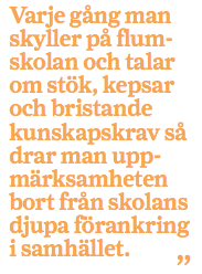 Den som funderar över varför svensk skola är en helt annan samhällsinstitution än förr har ganska mycket att hålla i huvudet. Men Jan Björklund tar gärna risken och gamblar med att han kunde ha fått högre resultat på Pisa 2013 och fått lov att säga att förbättringarna berodde på flumskolan (eller hur han nu skulle ha räddat sig ur den situationen …) – för det är ännu viktigare för honom att absolut inte koppla skolans prestation, eller ens skolans nuvarande utformning, till samhällsförändringarna som han politiskt medverkar till varenda dag. Det är den farligaste av alla frågor, för den är i djupaste mening politisk och knyter an till hela frågan om vilket slags samhälle vi vill ha.