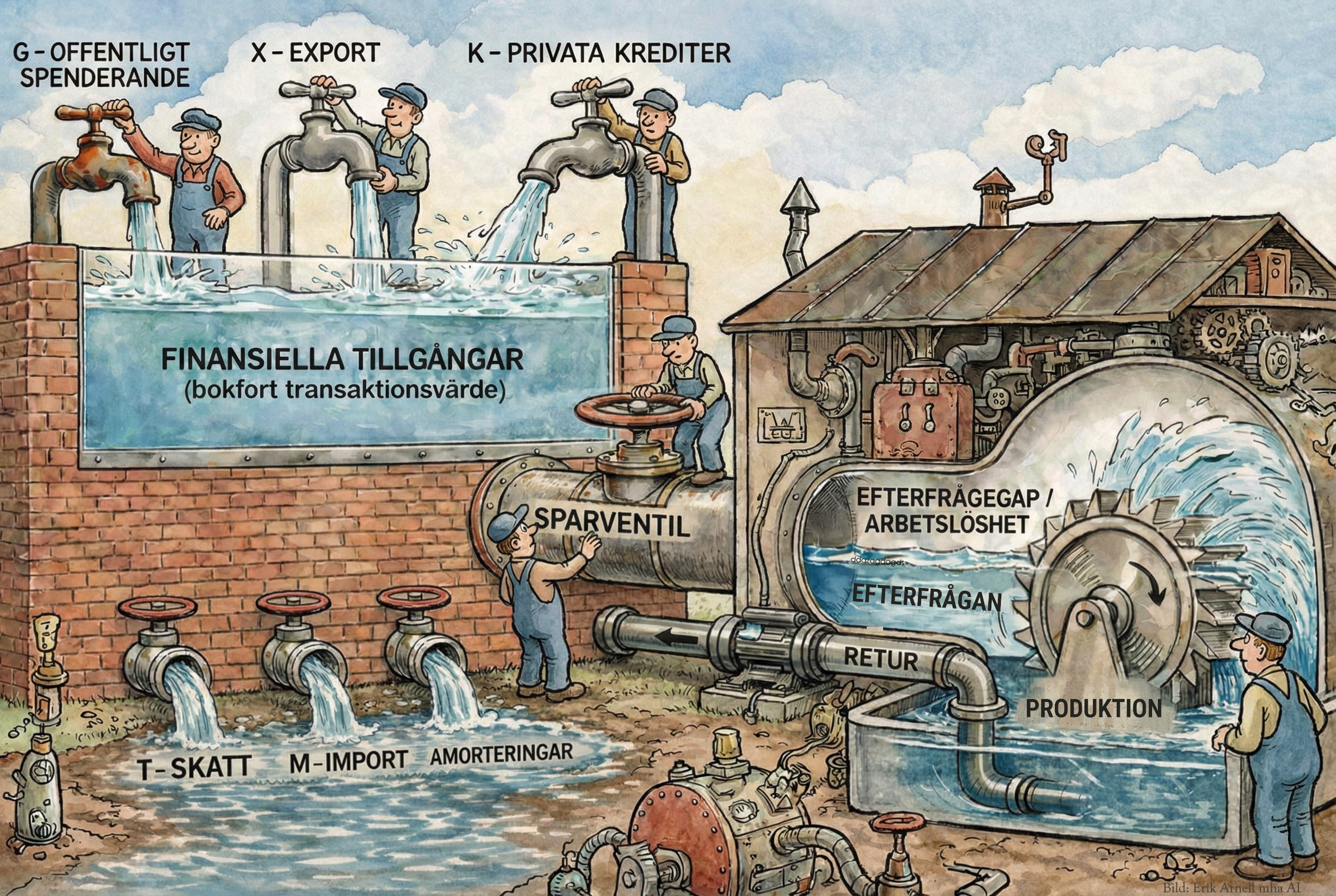Reservoaren fylls på från tre kranar: offentliga utgifter, privata bankkrediter och export. Den töms genom tre avlopp: skatter, amorteringar och import. Vattnet flödar från reservoaren genom ett rör mot turbinen, men en sparventil reglerar hur mycket vatten som faktiskt når turbinen. Sparandet – hushållens buffertar, pensionssparande, företagens kassor och så vidare – håller vatten kvar i reservoaren.
