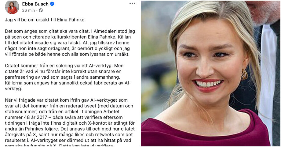 När Ebba Busch ska be om ursäkt för det felaktiga citat hon basunerade ut i sitt Almedalen-tal i år så blir det både dråpligt och direkt skrämmande. Vår vice statsminister avslöjar mellan raderna att hon inte alls förstår hur ”AI” fungerar. Genom sina godtrogna uttryck underblåser hon en oerhört missvisande bild till hela svenska folket. Det är tanklöst och ansvarslöst.