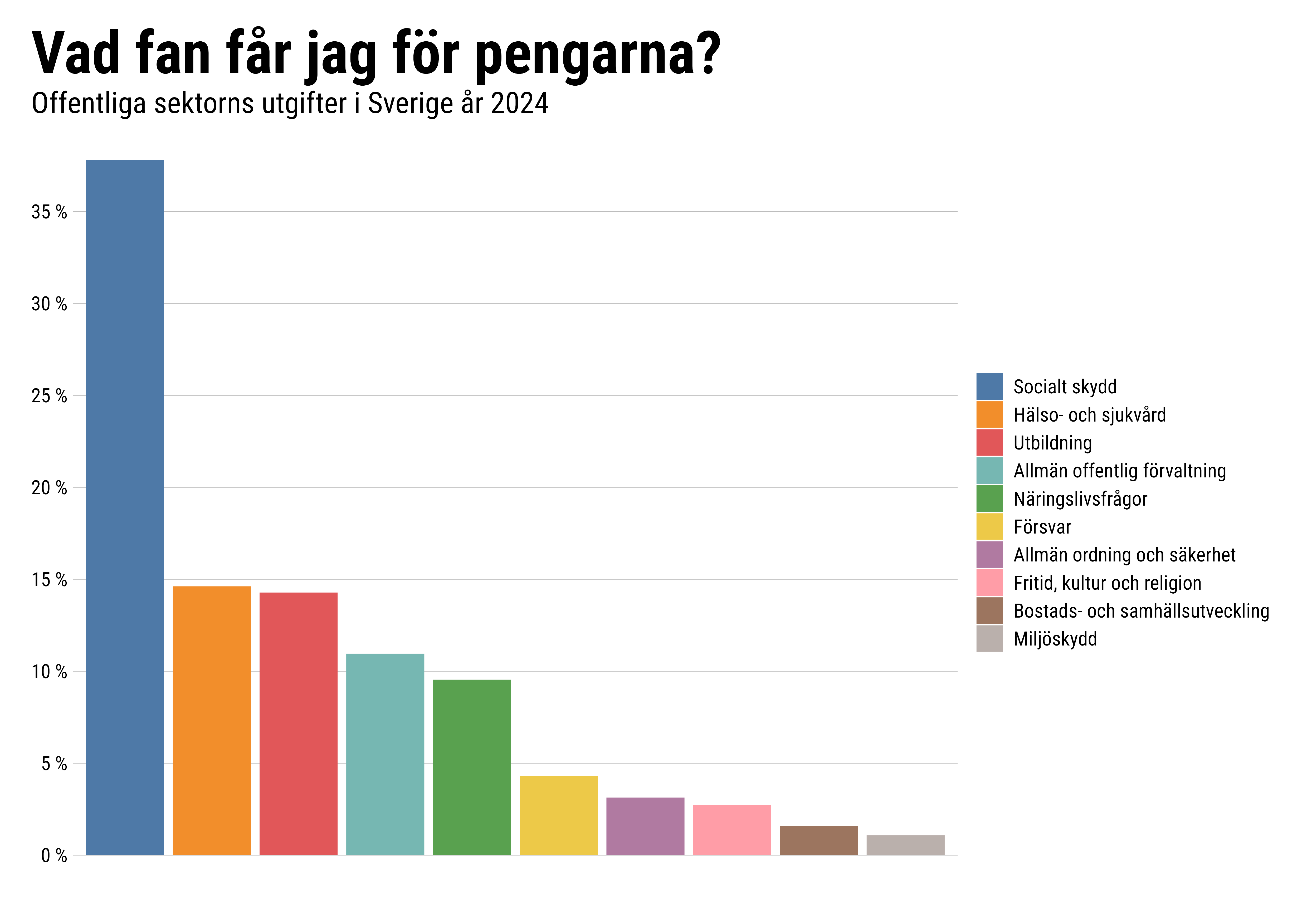 Ytterligare två stora områden som står för omkring 10 procent vardera är offentlig förvaltning (här ingår forskningsanslag och Sveriges internationella bistånd) och näringslivsfrågor (framförallt transportinfrastruktur). Sen kommer försvarsutgifter och utgifter som rör samhällskydd och rättsfrågor. De sista fem procenten av våra gemensamma utgifter går till kultur- och fritid, bostadsförsörjning och miljöskydd.