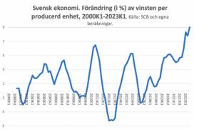 För företagens lönsamhet ligger på en extremt hög nivå. Det ser vi av diagrammet. I det visas hur lönsamheten per produkt har utvecklats i svensk ekonomi sedan millennieskiftet. Men som du ser – det är inte bara den extrema snabba lönsamhetsförbättringen den allra senaste tiden som är utmärkande för diagrammet. Vi ser också att under pandemiperioden var lönsamhetsutvecklingen mycket gynnsam – och detta trots att ekonomin krympte. Det tredje vi ser av diagrammet är att den här perioden med förbättrad lönsamhet är ovanligt lång.