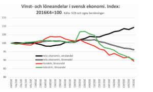 Avslutningsvis: Har den snabba förbättringen av lönsamheten per produkt sedan skarven 2016-17 också resulterat i en högre vinstandel och en lägre löneandel i svensk ekonomi?
