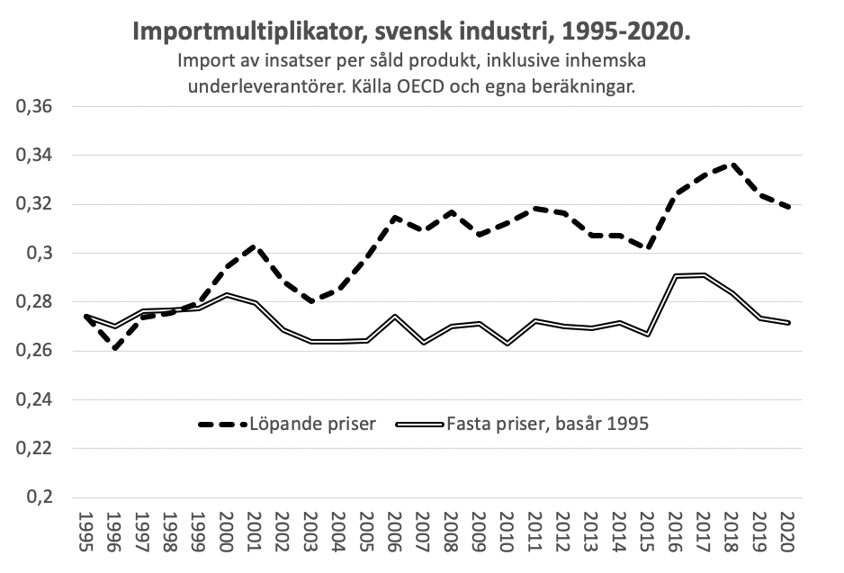 Ett preliminärt resultat ser du i diagrammet nedan. Det som framkommer är att användningen av importerade insatser inom svensk industris inhemska produktionskedjor trendmässigt har ökat på ett betydande sätt i termer av löpande priser mellan 1995 och 2020. Någon varaktig nedgång eller ett tydligt avstannande efter finanskrisen går dock inte att skönja. Tvärtom – under de 3-4 senaste åren har den nominella importmultiplikatorn legat på sin högsta nivå sedan åtminstone mitten av 1990-talet.
